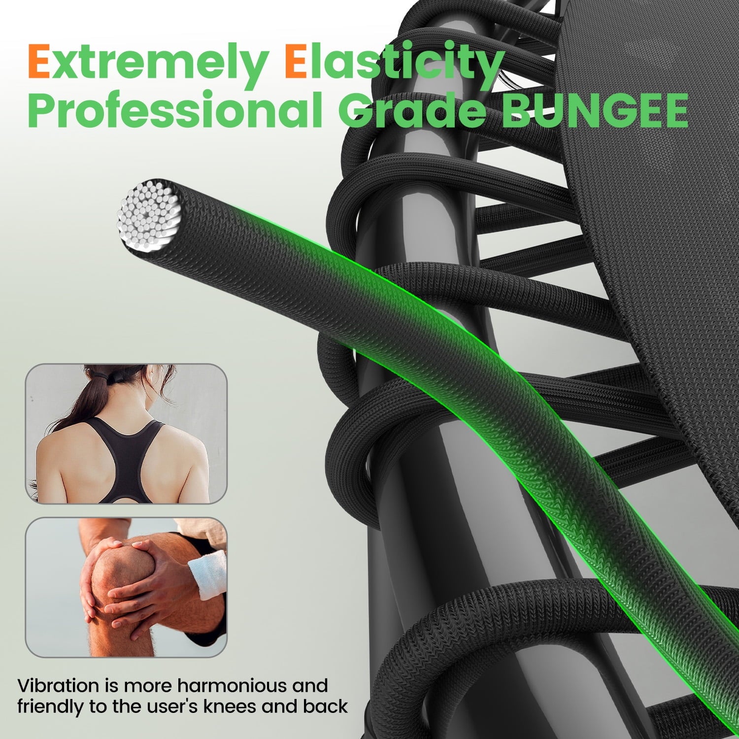 - Quiet Bungees - BCAN Bungee trampoline offers a safer, quieter experience with 95% less noise than spring trampolines. The thickened bungees ensure comfort and knee/back protection.