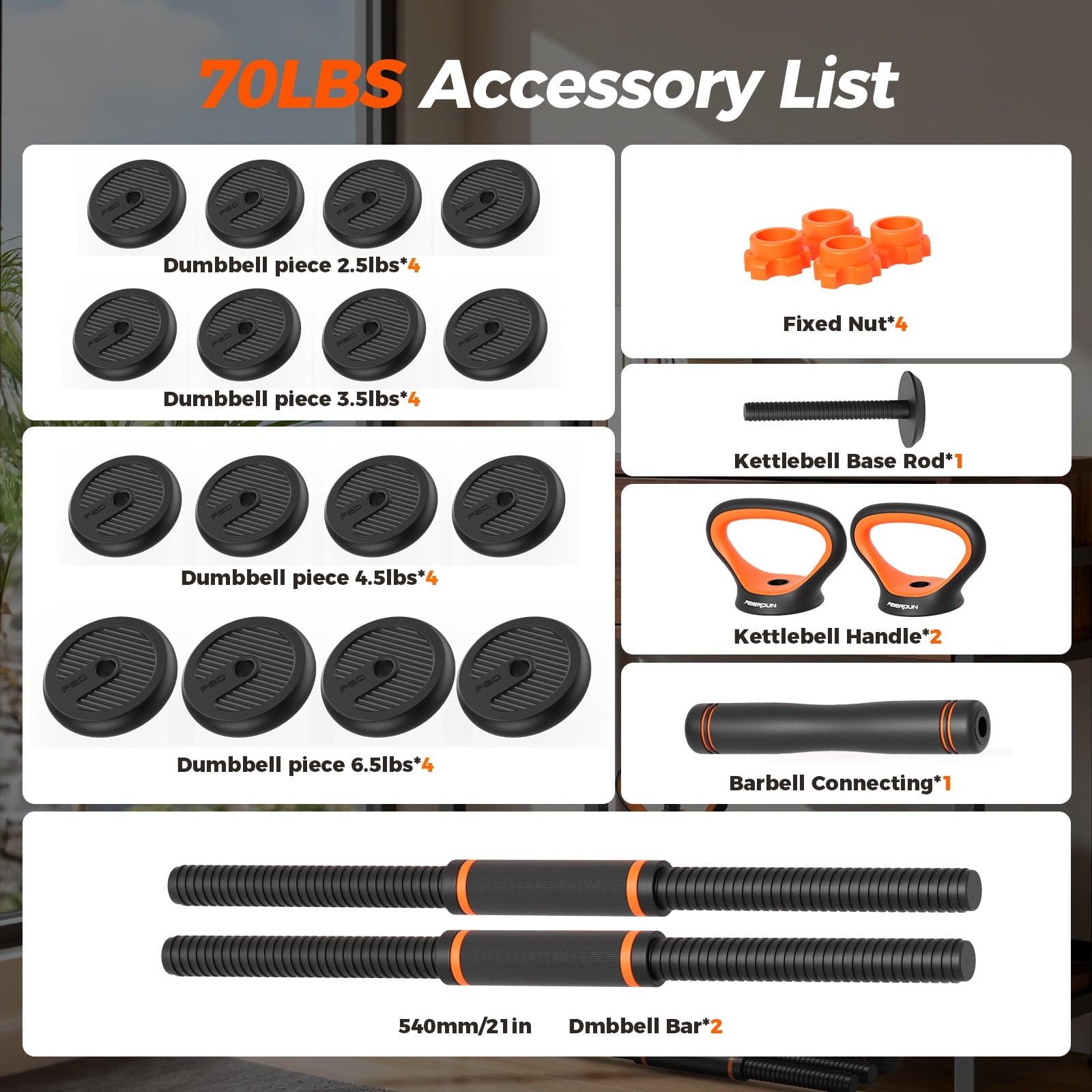 UPGO Adjustable Dumbbells,70lbs Free Weight Set with Connector,5 in1 Dumbbells Set as Barbell,Kettlebell,Push up Stand,Weight Plate,Fitness Exercises for Home Gym Suitable Men/Women
