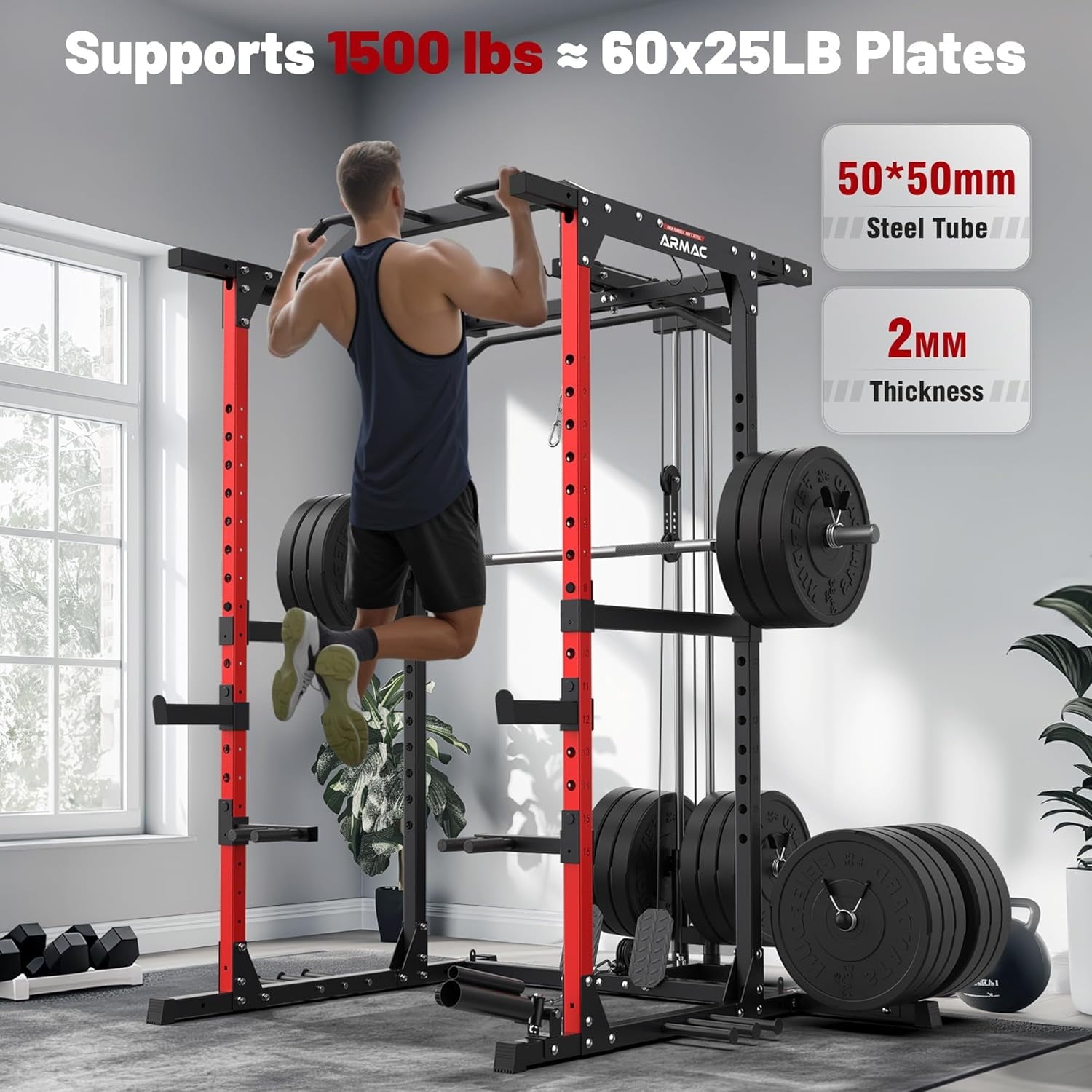 - 【Supports 1500 lbs ≈ 60x25LB Plates】UPGO power cage is designed for ultimate stability, with right angle connecting plates between posts. The specification is 50X50 MM, the tube thickness is 2 mm, and the sturdiness is unparalleled. It can withstand frequent use and high-intensity training.