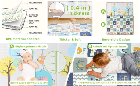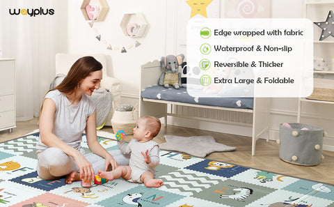 Wayplus baby play mat is a lightweight, foldable, play mat ideal for home, time spent outdoors, and when traveling. Ideal in protecting those little hands and feet by covering hard surfaces or to create a play space folds up in seconds to be tucked away for later use.Wayplus baby play mat exceeds the standard of ASTM, CPC on both chemical and physical. And adopts safer XPE material, which is completely flame retardant, hypoallergenic, non-toxic, and BPA-free. Edges are covered with fabric to ensure long-term use.It is a worry-free ground for the parent when the baby is playing.